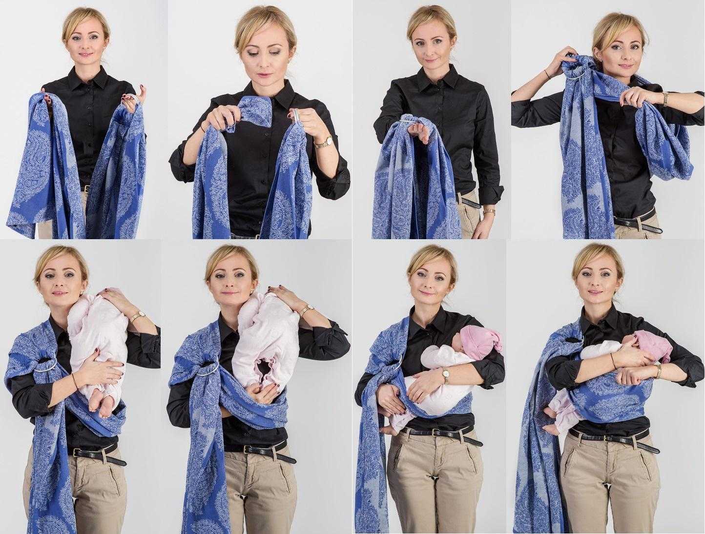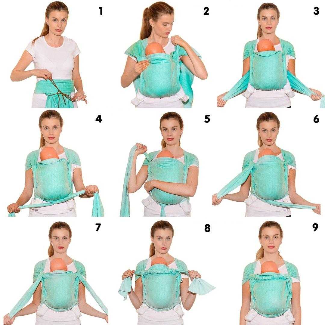 Надевать слинг можно несколькими способами. Гибкое полотно позволяет удобно класть младенца, чтобы он ощущал себя как в колыбельке. Также его можно посадить лицом к маме.