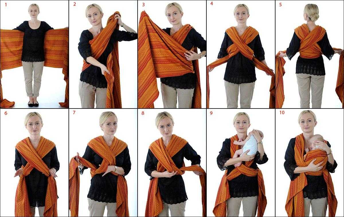 Шарф – это еще один простой и удобный слинг с рождения. Он универсален, так как малыша можно привязывать спереди, на спине и даже сбоку, размещать в горизонтальном или вертикальном положении. Этот слинг представляет собой полосу ткани длиной от 3 до 6 метров, которой малыш особым образом приматывается к телу мамы. Он обеспечивает правильное положение позвоночника, поддержку головки и дает возможность развести ножки. Удобен шарф также для мамы: он равномерно распределяет нагрузку на оба плеча и поясницу.