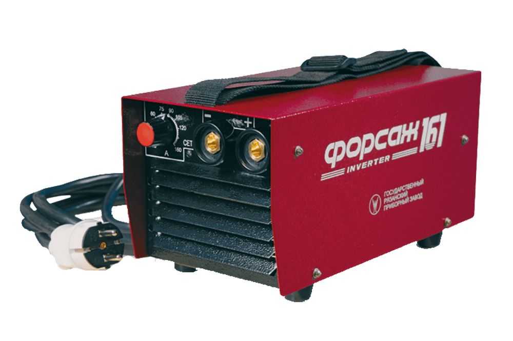 В наш обзор профессиональных сварочных аппаратов инверторов вошла модель Форсаж-161. Это сварочный инвертор производства Рязанского приборного завода хотя и не потрясает заявленными характеристиками или сверхсовременным дизайном, зато даст профессионалу именно то, что ему нужно – надежность и точность формирования вольтамперной характеристики сварочного тока в режимах MMA и TIG. В обоих случаях максимальный сварочный ток – 160А, но непрерывная работа возможна при токе не более 100А. Следовательно, этот инвертор наиболее пригоден для работы с достаточно тонким металлом, не требующим глубокого провара на высоком токе. К числу достоинств аппарата нужно отнести возможность работы при сильных просадках напряжения – заявленная производителем работоспособность при 140В в розетке прекрасно подтверждается на практике. «Мягкая» дуга легко разжигается и горит без сильного разбрызгивания металла. Примененное в инверторе автоматическое управление вентилятором по сигналу от датчика температуры ощутимо снижает количество засасываемой в корпус пыли, соответственно делая более редкой и необходимость чистки радиаторов выходного каскада.