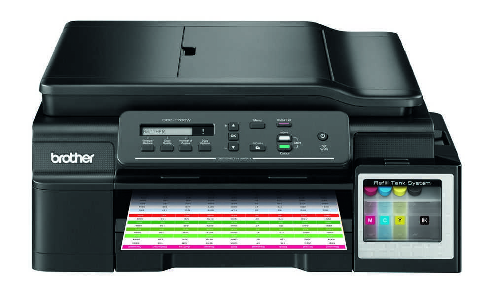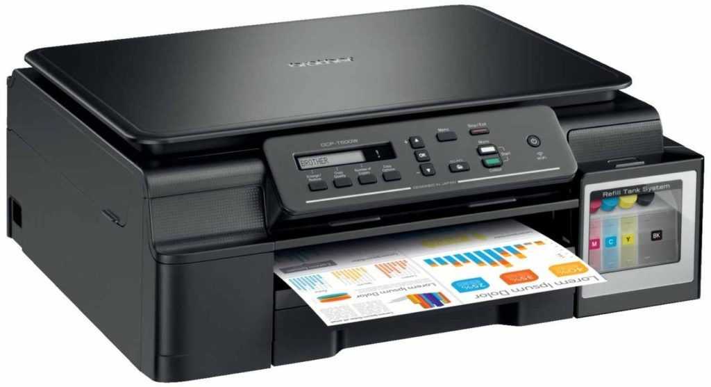 Эта модель МФУ удобна наличием перезаправляемых емкостей для чернил. Не трубует проводить дополнительных закупок картриджей или самим подключать СНПЧ. Скорость печати небольшая: цветных документов в минуту до 6 страниц. Но печать фотографий отличается высоким качеством, приближенным к профессиональному. В сравнении со струйными собратьями это устройство отличается почти бесшумной системой самоочистки. В рабочем режиме потребляет 18 Вт. Наличие Wi-Fi и установленного софта Brother позволяет осуществлять распечатку с телефона или планшета.