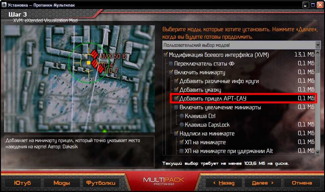 Первое, на что я хочу обратить внимание для тех, кто играет на арте – возможность «Добавить прицел АРТ-САУ» на миникарту, по которому можно сравнительно точно наводиться на пропавшего из засвета противника