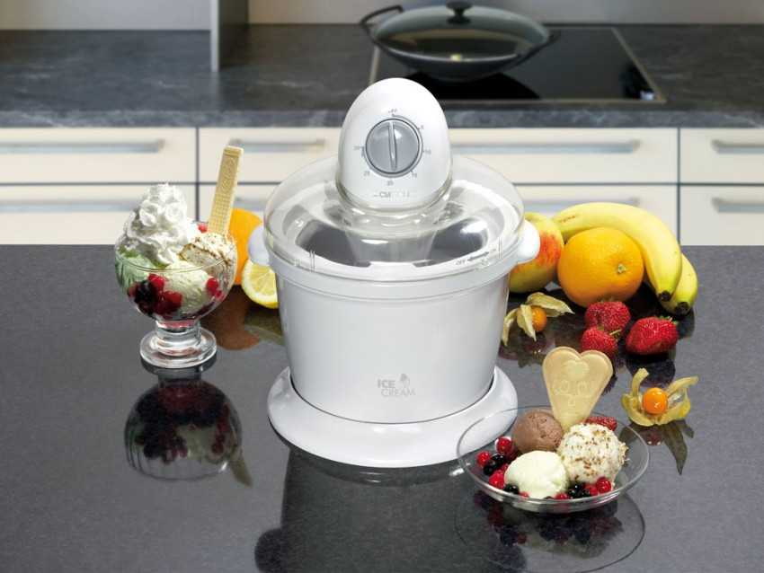 Отличной моделью, позволяющей приготавливать любимое лакомство в домашних условиях, является мороженица от компании Clatronic. От прочих полуавтоматических моделей, представленных в нашем обзоре, этот прибор отличается наличием сразу 2 чаш, объёмом 0,5 кг каждая. Такая конструкция позволяет приготовить сразу около килограмма холодного десерта, причём с разными наполнителями. В зависимости от используемых ингредиентов время работы варьируется от 15 минут до получаса. Правда, перед началом работы чашу придётся охлаждать в холодильнике не менее 12 часов.