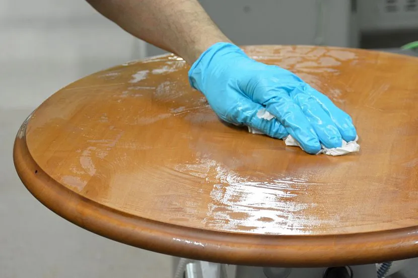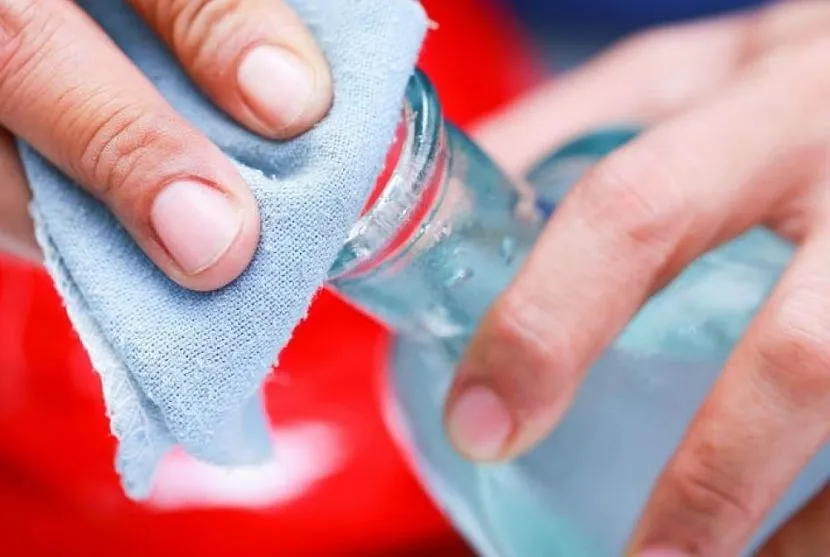 Кусочек ткани увлажняют выбранным растворителем, затем аккуратно наносят его на поверхность