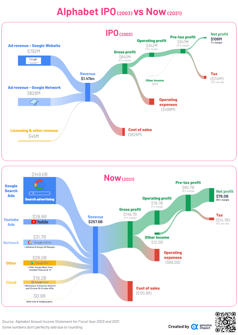 When Google went public in 2003, it was a simple search engine that generated about $1.4 billion in ad revenue from its website and cloud network.