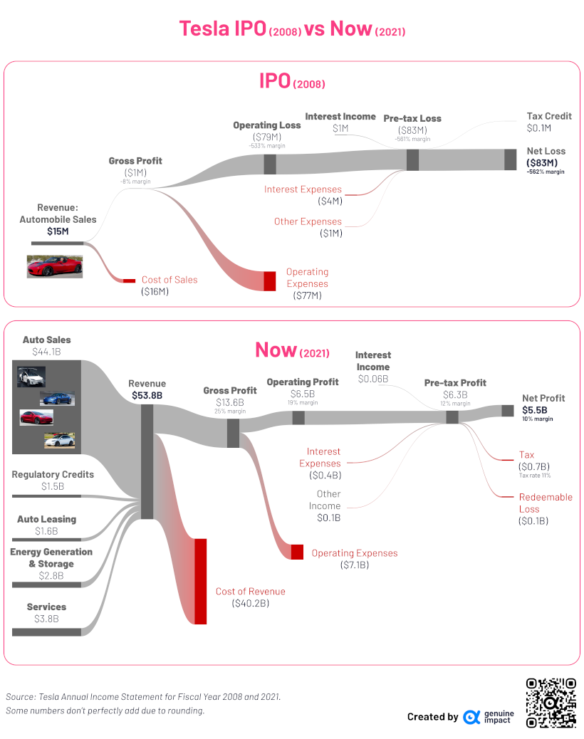 Tesla’s IPO was in 2008, making it the youngest company on the list. And as the newest kid on the block, Tesla’s revenue streams haven’t changed as drastically as the others have.