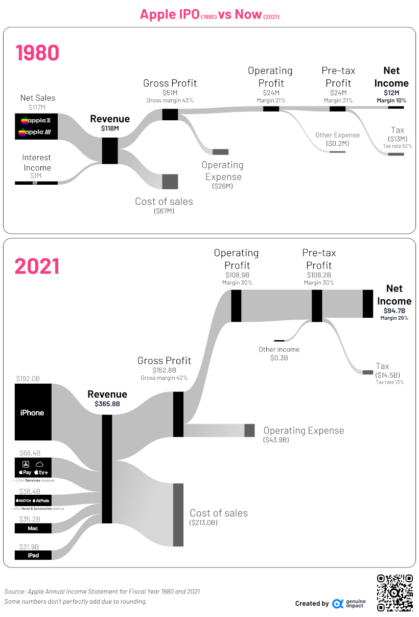 Let’s start with Apple, the first company to go public, and the biggest in the mix: