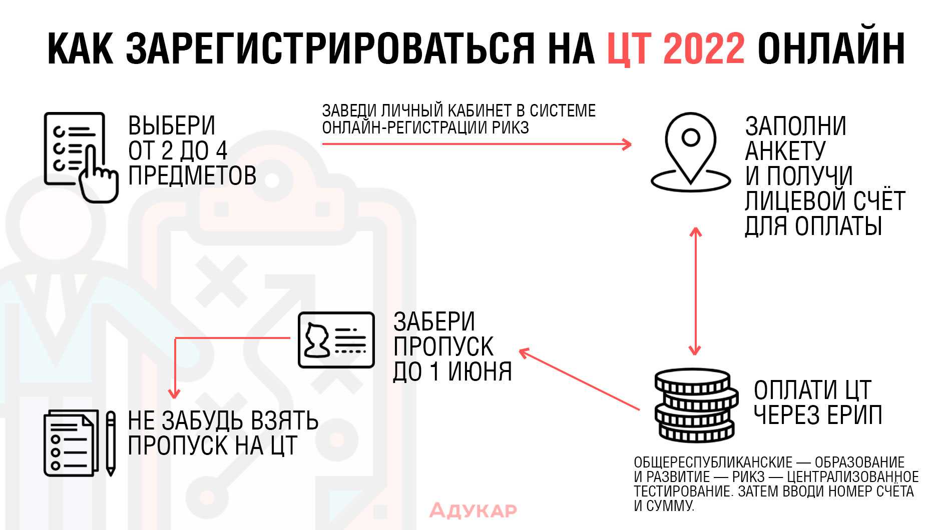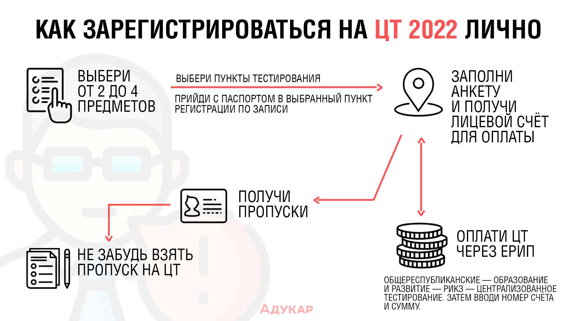 Если ты хочешь записаться на ЦТ офлайн, тебе нужно лично прийти в один из ближайших пунктов ЦТ. Их всего 41. При себе обязательно нужно иметь паспорт и деньги для оплаты ЦТ.
