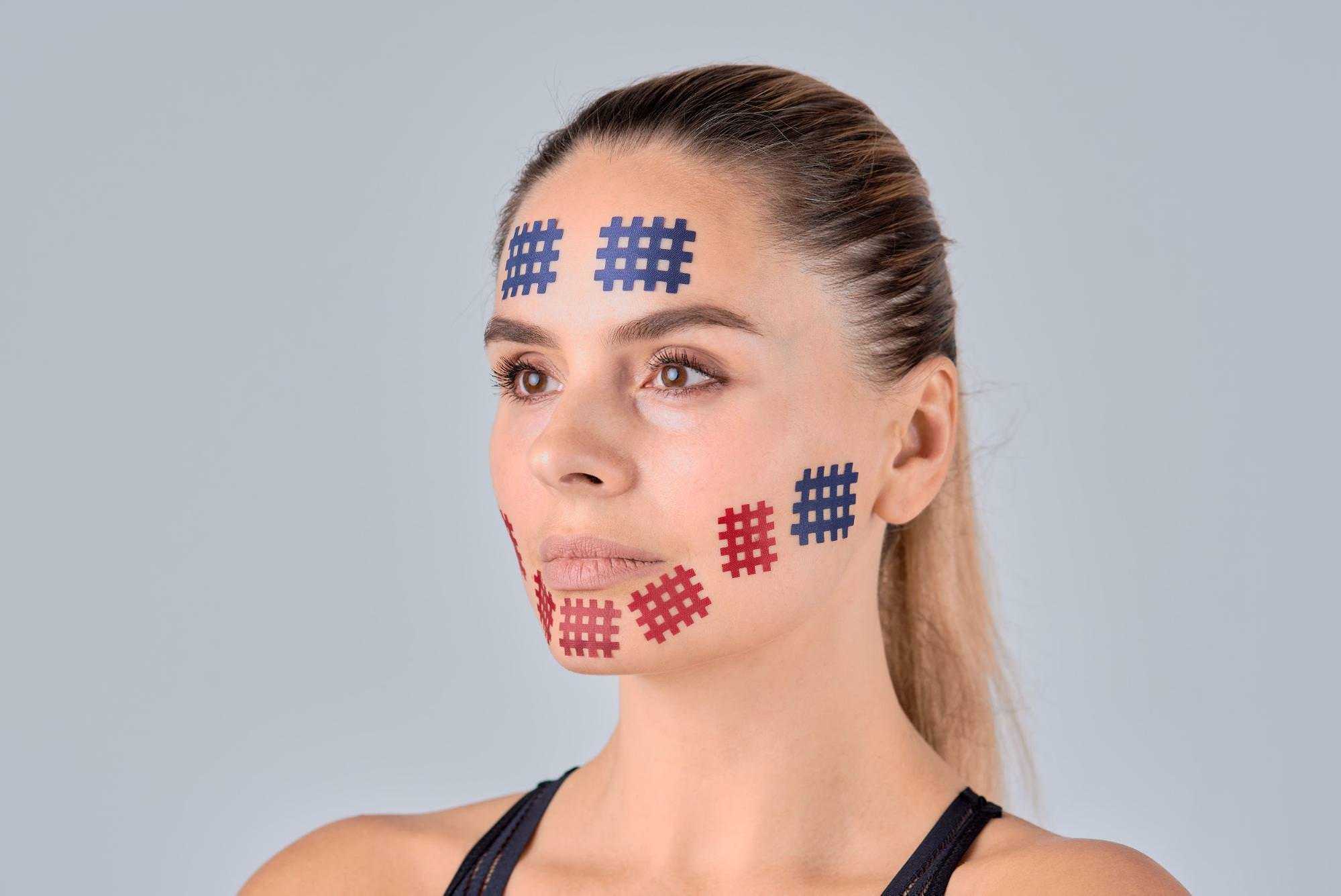 - Кинезиотейп. Наиболее популярная разновидность. По сути, представляет собой усовершенствованную версию пластыря. Они могут быть хлопковыми и мягкими или же более жёсткими (когда требуется точечная фиксация конкретного участка лица). В эластичных кинезиотейпах присутствуют примеси нейлона или синтетической вискозы (порой их называют шёлковыми). Чаще всего эти виды тейпов делаются цветными. Никаких подтверждений того, что цвет связан с определённым эффектом, нет (так что синие тейпы вряд ли будут успокаивать, а розовые поднимать настроение и т.д.). Но вы всегда можете сделать селфи с такими яркими пластырями – этого никто не запретит.