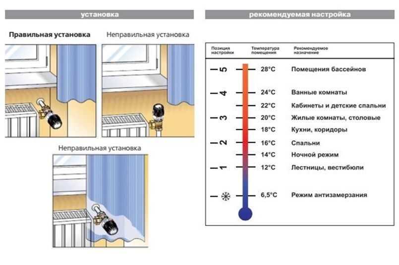 Чтобы кран с термоголовкой для радиатора функционировал правильно, следует выполнить предварительную настройку. Требуется включить отопление в помещении и закрыть двери и окна. В определенной точке ставится термометр, после чего выполняются настройки. Схема настраивания устройства следующая: