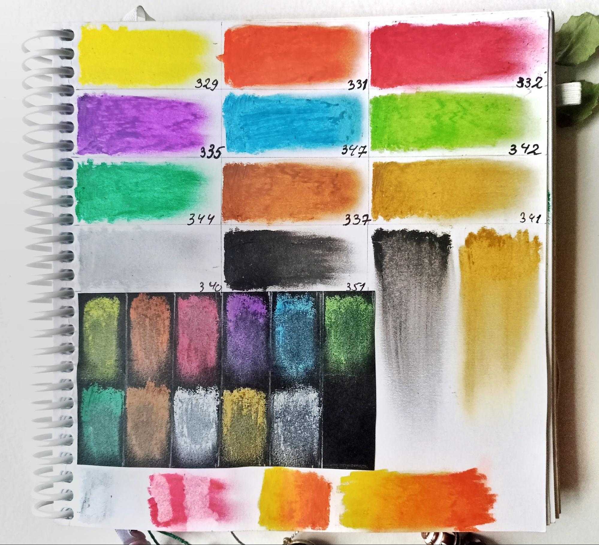 На чёрной бумаге цветов почти не видно, жаль. Насчёт смешиваемости и наслаиваемости могу сказать следующее: правило «чем больше растираешь, тем сильнее всё покрывается проплешинами» работает в данном случае на 250 %.