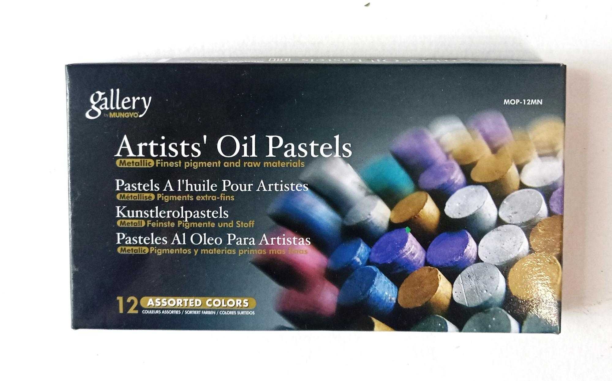 Коробка у него почти такая же, как у классического на 24 штуки, за исключением изображения на обложке: тут не натюрморт, а просто фото металликов. Внутри всё лежит аналогично на подложке. Брошюры не наблюдается (возможно, потому, что эти мелки не входят в основную палитру, а являются своего рода отдельной линейкой). На обороте крышки — названия и номера цветов (только чёрным по белому, а не белым по чёрному, как у классики).