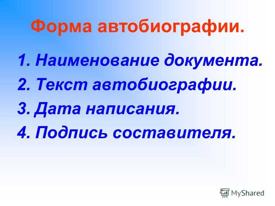 - Автобиография Что такое автобиография? Зачем надо уметь писать автобиографию? Образцы написания автобиографий. План написания деловой автобиографии. Упражнения. – презентация