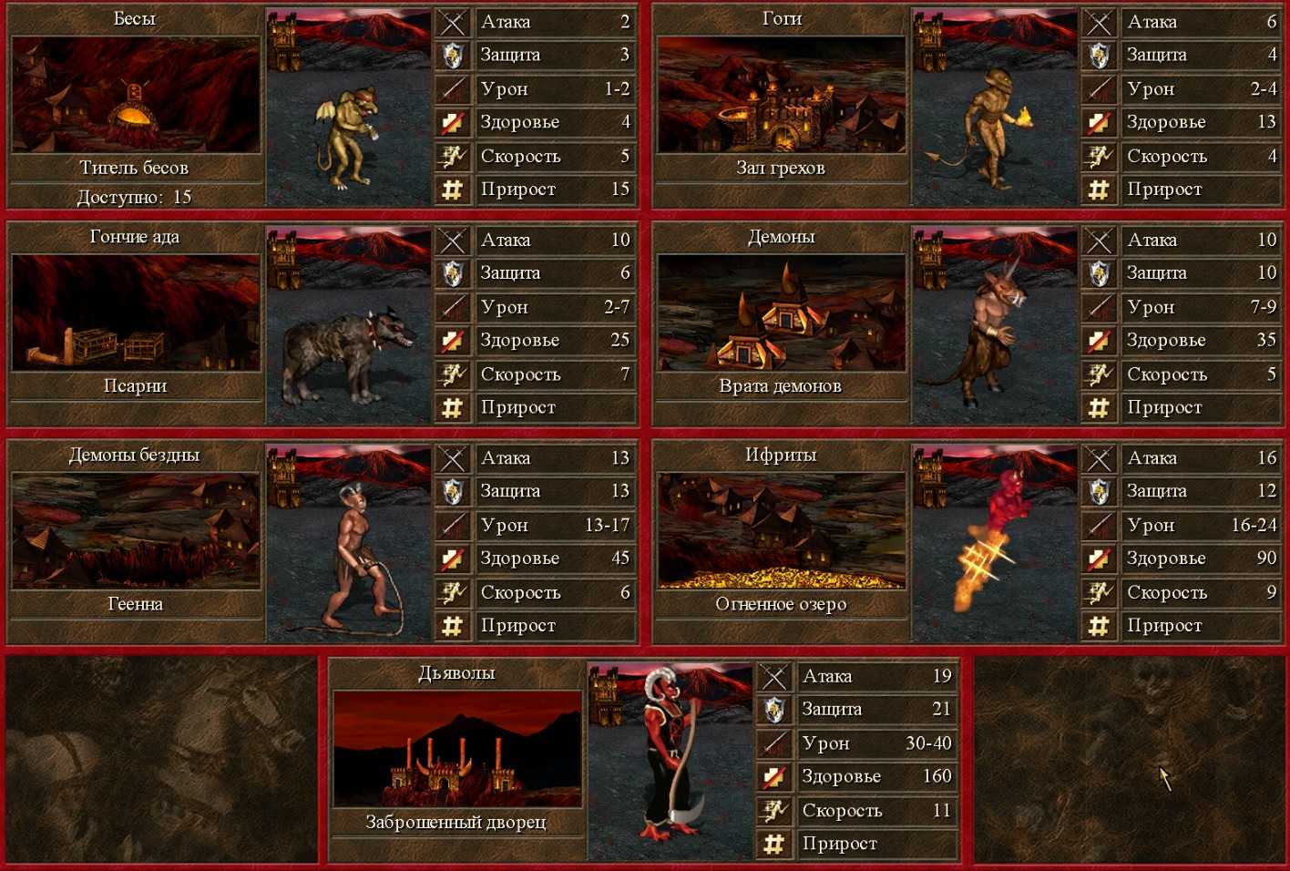 Армия Инферно по своим характеристикам никакая – самая слабая по здоровью, слабая сила удара, высокоя стоимость и всего один юнит с антимагической защитой. Единственное что есть у демонов — скорость всех юнитов (хотя у Сопряжения юниты ещё бвстрее). Однако даже у демонов есть козыри. Дьявол (для седьмого уровня слабый по здоровью, но очень быстрый, с безответным ударом и такими навыками, что в единоборстве любого вполне может завалить), Ифрит (очень быстрый, крепкий, невосприимчивый к магии Огня и Волшебной стреле, а улучшенный он ещё и будет окружен огненным щитом), Адское Отродье (или Владыка Бездны, хоть и с малым здоровьем, но мощным ударом, умеющий поднимать демонов из павших союзников), Цербер (быстрый, для своего уровня довольно крепкий и с сильным безответным ударом, поражающим до трех целей). Так что при желании и демоны могут показать, где раки зимуют.