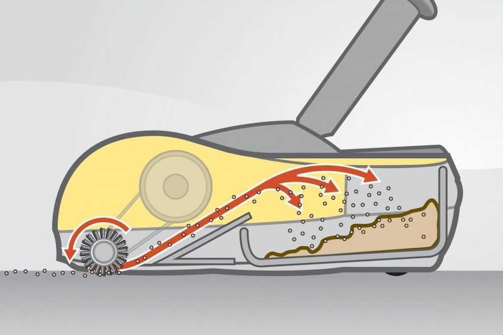 Во время уборки необходимо удерживать прибор за рукоять. Она соединена с рабочим коробом крепежом и шарнирами, которые обеспечивают подвижность устройству. Ручку можно выставлять под углом до 180°, что позволяет очищать поверхности даже под крупногабаритной мебелью. Основные элементы конструкции – щетки, расположенные внутри. Их количество меняется в зависимости от модели, конструкции. Это определяет уровень эффективности устройства. Мусор попадает в приемник, расположенный внутри. Этому способствует наклонная плоскость, она находится под углом между входным отверстием и задней стенкой.