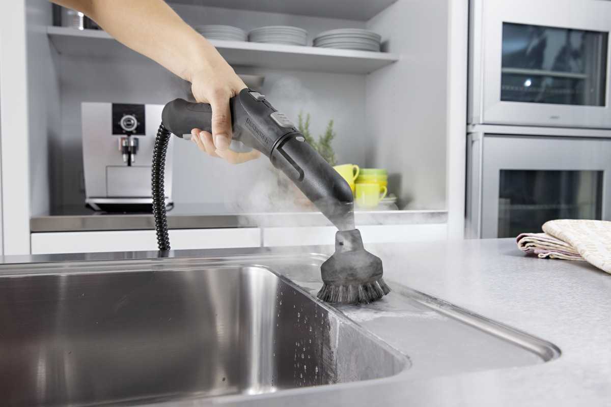 Мыть кухню необходимо по тому же принципу, что и ванную комнату. Никаких принципиальных отличий при чистке накипи и жира нет. Помимо всего прочего, пароочиститель также применяется и для обработки кухонной мебели. Им можно обрабатывать любой твердый материал, будь то керамика, кафель, стекло и т.д.