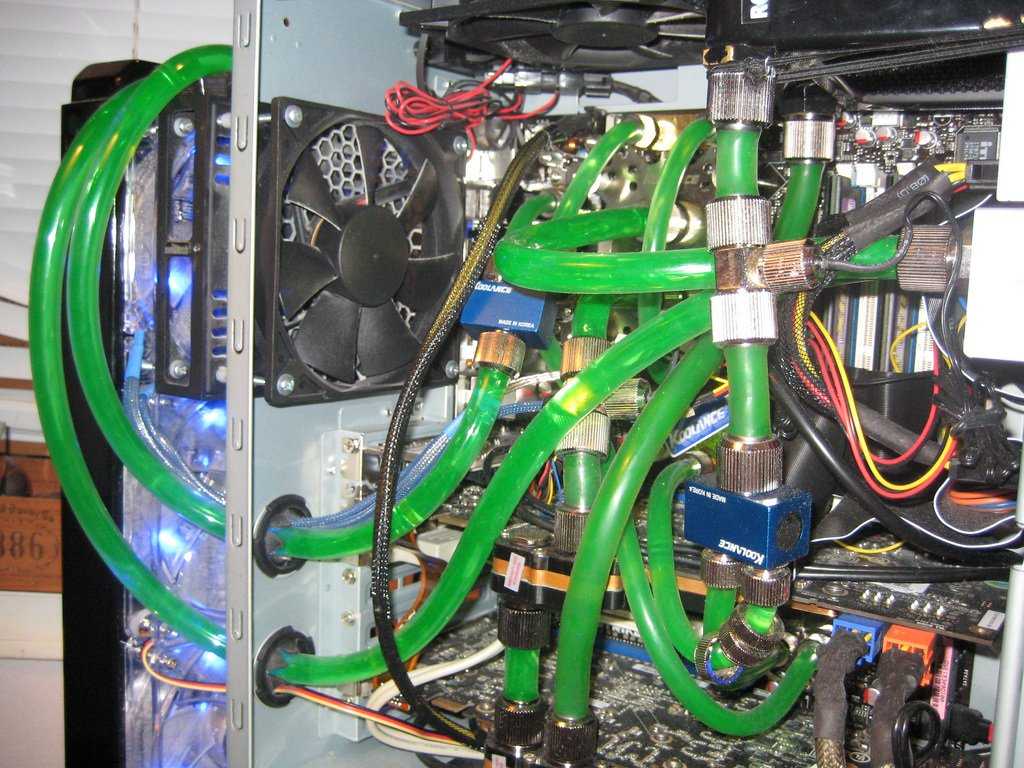 - Система жидкостного охлаждения – такая система подразумевает использование жидкостей. Те же процессоры набранное тепло передают на радиатор при помощи специальной жидкости (антифриз), которая циркулирует по ПК и охлаждается, либо во время циркуляции по ПК, либо при помощи тех же вентиляторов.