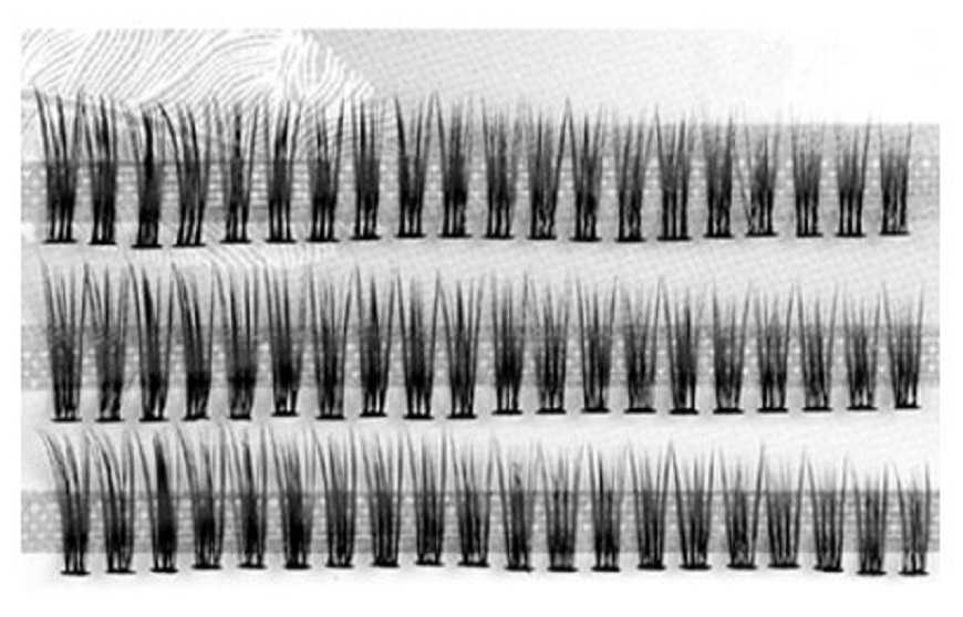 Набор, сделанный в Германии, предназначен для повседневного применения. Лента крепится с помощью двух магнитов, расположенных по краям. На накладке закреплены пирамидальные пучки из волос разной толщины и густоты. Они создают эффект длинных ресниц, похожих на опахала.