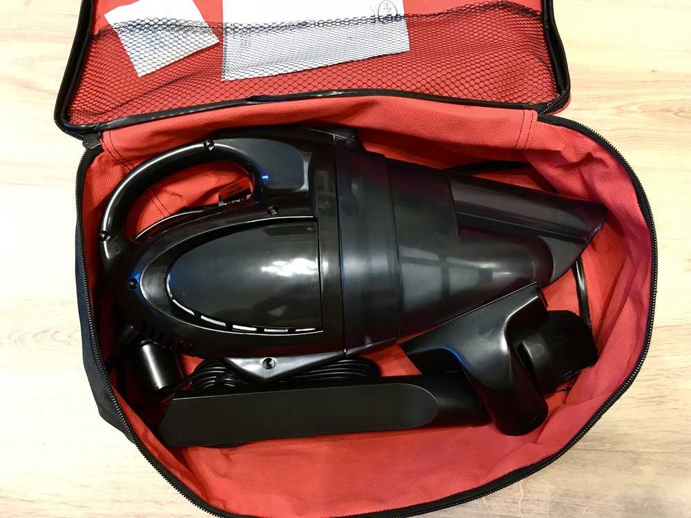 Наличие фильтра тонкой очистки позволяет эффективно очищать воздух от загрязнений. А в комплекте есть не только обычная щётка и насадка для щелей, но и широкое приспособление для очистки ковриков и ткани. Длина шнура автомобильного пылесоса – 3,67 м, шланга – до 1,15 м, а для подсветки зоны очистки предусмотрен светодиодный фонарик. В комплекте идёт прочная тканевая сумка, где можно хранить и прибор, и насадки.