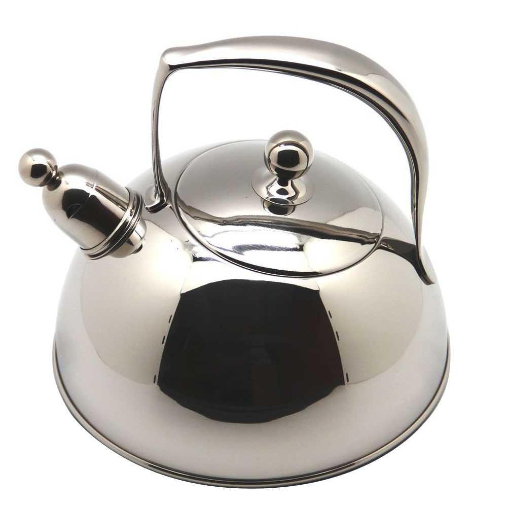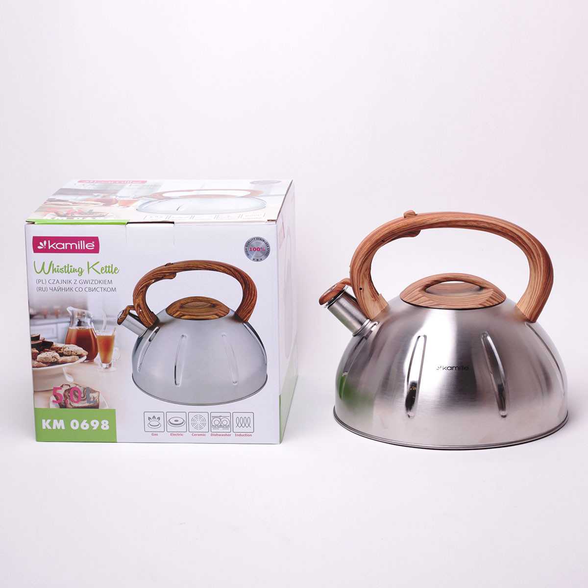 Чайник из нержавеющей стали и с трехслойным основанием устойчив к коррозии. Сохраняет вкусовые характеристики. Конструкция кухонного оборудования равномерно распределяет тепло. Оснащен ручкой из пластика, откидным свистком. Предназначается для всех типов плит, исключением является индукционные. Адаптирован для мытья в посудомоечной машине. Стоимость – 500 руб.