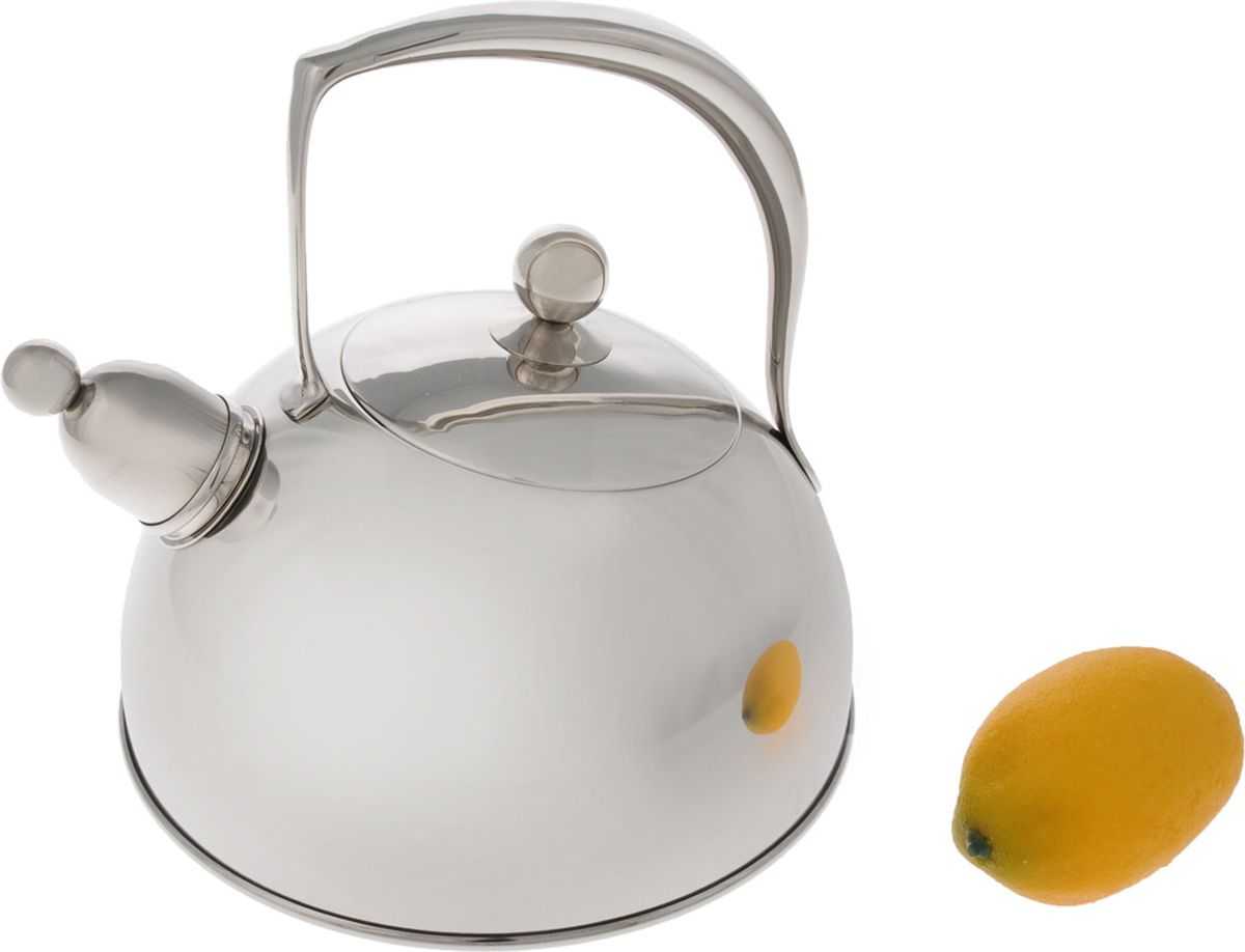Кухонная утварь, сделанная из нержавеющей стали, имеет объем 2,5 л. Благодаря этому чайник имеет длительный срок эксплуатации. Подходит для электрических и газовых плит. Диаметр основания – 21 см. Стоимость – от 2 600 рублей.