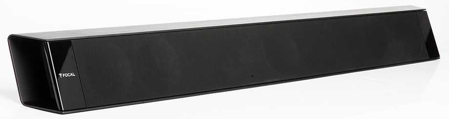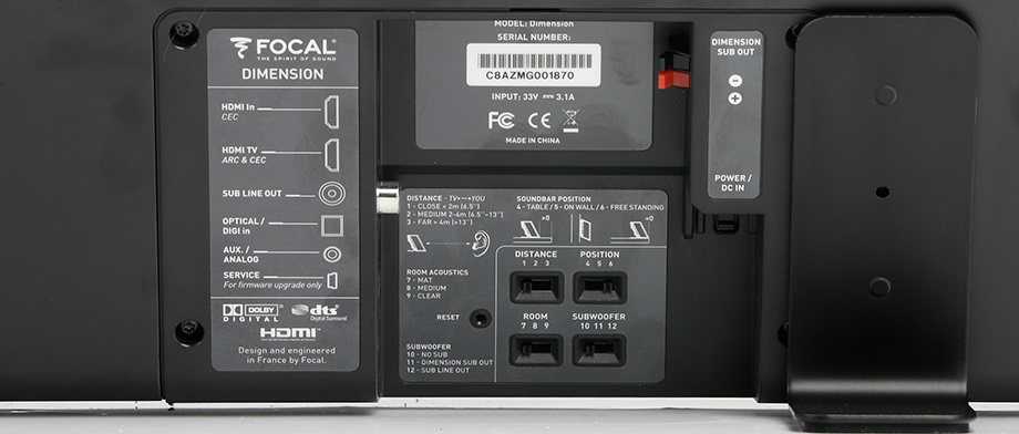 Модель Dimension — это первая «проба пера» французской компании Focal в проектировании саундбаров. Она представляет собой активную модель с довольно мощным 6-канальным усилителем на 320 Вт и неплохим функционалом, включающим поддержку декодирования Dolby Digital, DTS, поддержку обратного канала ARC и CEC команд через HDMI, а также объемное звучание, подстройку характеристик звучания под местоположение аппарата и слушателя, выход на сабвуфер. Звуковой сигнал может приниматься как по ARC, так и с HDMI-входа, оптического или линейного (миниджек) входов. Для этой модели специально предусмотрен пассивный сабвуфер Focal Dimension Sub (дополнительно около 20 000 руб.), подключающийся к саундбару по высокоуровневому входу. Но можно использовать и любой другой сабвуфер, поскольку модель оснащена стандартным LFE-выходом. В качестве излучателей используются пять фирменных патентованных ультраплоских (26-мм) 100-мм динамиков с бумажными диффузорами. С левого и правого торца устройства выведены рупоры фазоинверторов. Управлять моделью можно как с корпуса аппарата (сенсорные кнопки), так и с пульта собственного ДУ, а также через телевизор, подключенный по HDMI (команды CEC).