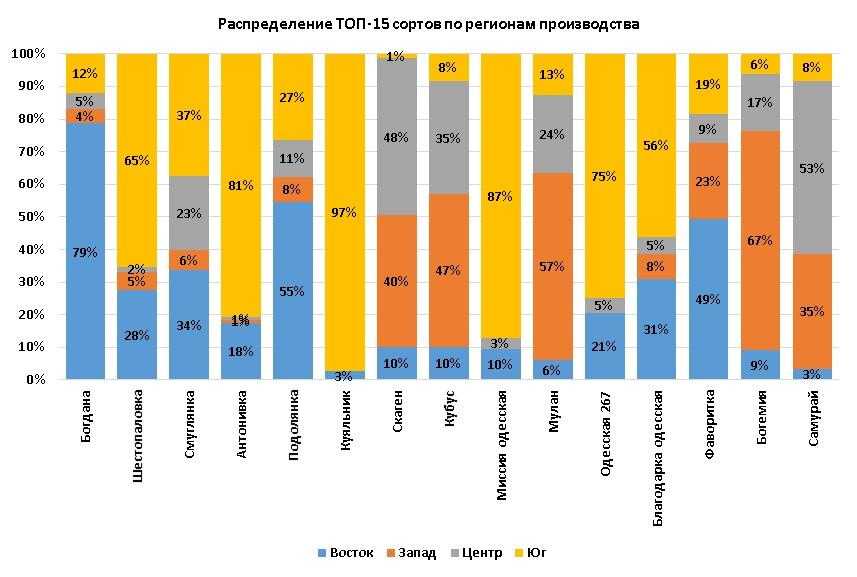 Учитывая особенности каждого сорта и рекомендации по климатическим условиям для возделывания каждого из сортов, сортовые предпочтения в разных частях страны также существенно отличаются. Так, рассматривая ТОП-15 сортов в разрезе регионов, следует отметить, что в южных областях наиболее распространено использование семян сортов Шестопаловка, Антонивка, Куяльник, Миссия одесская, Одесская 267 и Благодарка одесская. В то же время, аграрии восточных областей информировали о том, что отдают предпочтение сортам Богдана, Подолянка и Фаворитка.