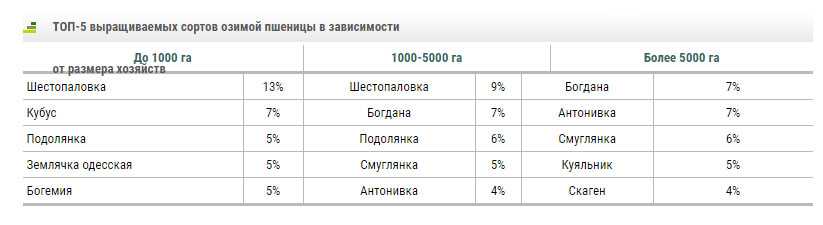Стоит отметить, что сортовые предпочтения и их разнообразие во многом завесили от размера хозяйства. Сельхозпредприятия с посевной площадью до 1 тыс. га в большинстве случаев отдавали предпочтение пяти сортам озимой культуры. Так, в ТОП-5 вошли Шестопаловка, Кубус, Подолянка, Землячка одесская и Богемия. В сегменте средних сельхозпредприятий (1-5 тыс. га) среди лидеров по засеянной площади были отмечены сорта Шестопаловка, Богдана, Подолянка, Смуглянка и Антонивка.