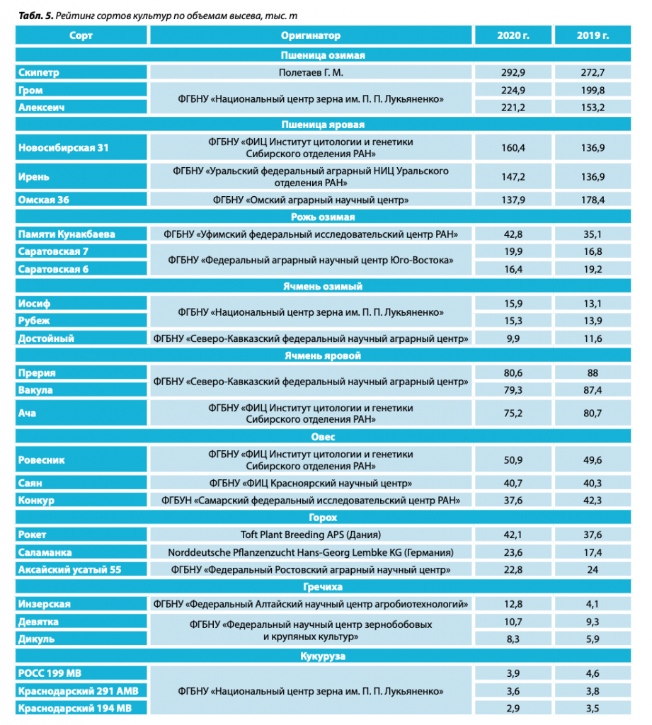 Следует отметить, что Указом Президента России от 21 января 2020 года № 20 «Об утверждении Доктрины продовольственной безопасности РФ» был введен новый показатель для данного критерия: «К 2025 году обеспеченность страны собственной селекцией в отношении семян основных сельскохозяйственных культур должна составлять не менее 75%». Проведенный специалистами анализ показал, что сейчас наибольшее количество отечественных селекционных достижений регистрируется по кукурузе, пшенице и ячменю. Отдельно необходимо отметить, что максимальная доля сортов зарубежного производства, по данным за март 2021 года, принадлежит кукурузе — 64,2%. В прошлом году этот параметр равнялся 65,6%. На втором и третьем местах соответственно находятся ячмень — 22,7 и 21,1%, горох — 19,2 и 53,8%. При этом по некоторым культурам, например просу, в государственный реестр включены только сорта отечественного производства. Таким образом, по числу селекционных достижений, входящих в утвержденный перечень, и показателю продовольственной безопасности допущенных к использованию сортов обозначенным в указе требованиям соответствуют все виды зерновых культур, кроме кукурузы. В целом зерновая отрасль за последние годы продемонстрировала хорошую тенденцию к развитию.