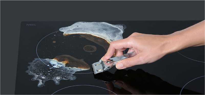 - Стеклокерамические варочные панели моют специальными неабразивными средствами, а пригоревшую пищу счищают металлическим скребком (обычно прилагается в комплекте). Кроме того, после чистки поверхность нужно обрабатывать и специальным полирующим средством, тогда панель становится блестящей и менее восприимчивой к загрязнениям.