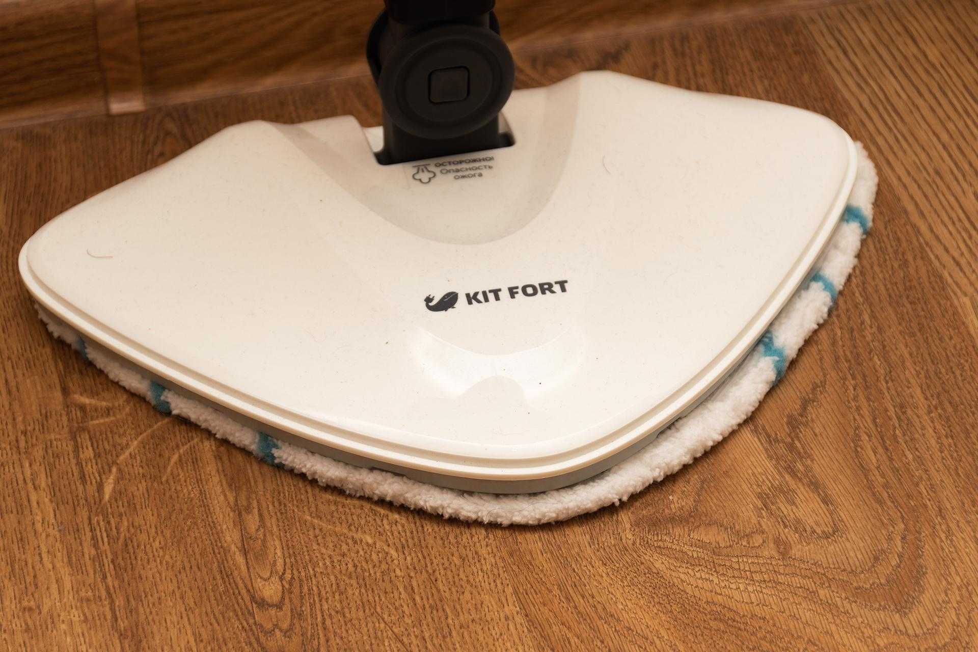 В комплекте идёт насадка-щётка для ворсистых поверхностей, тряпка из микрофибры для пола, рамка для жёстких ковров, а также мерный стаканчик для наполнения бака. Модель хорошо справляется с чисткой ламината, плитки и тканевых материалов. Благодаря высокой температуре пара можно проводить дезинфекцию.