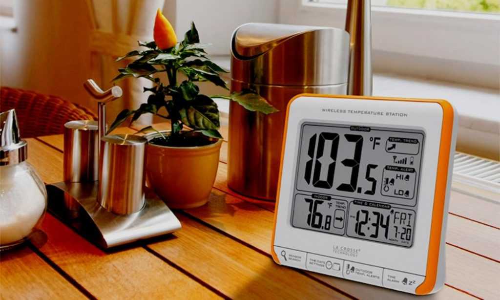 Хороший агрегат от известной марки. Выглядит он необычно, что видно даже по фото. Прибор умеет измерять температуру не только внутри помещения, но и снаружи. Вдобавок к этому, он показывает время. Устойчивые ножки гарантируют надежную фиксацию на поверхности. Кнопки в меру тугие, поэтому нажимать на них комфортно. Цифры на экране выглядят ярко и четко, сам экран имеет широкие углы обзора.