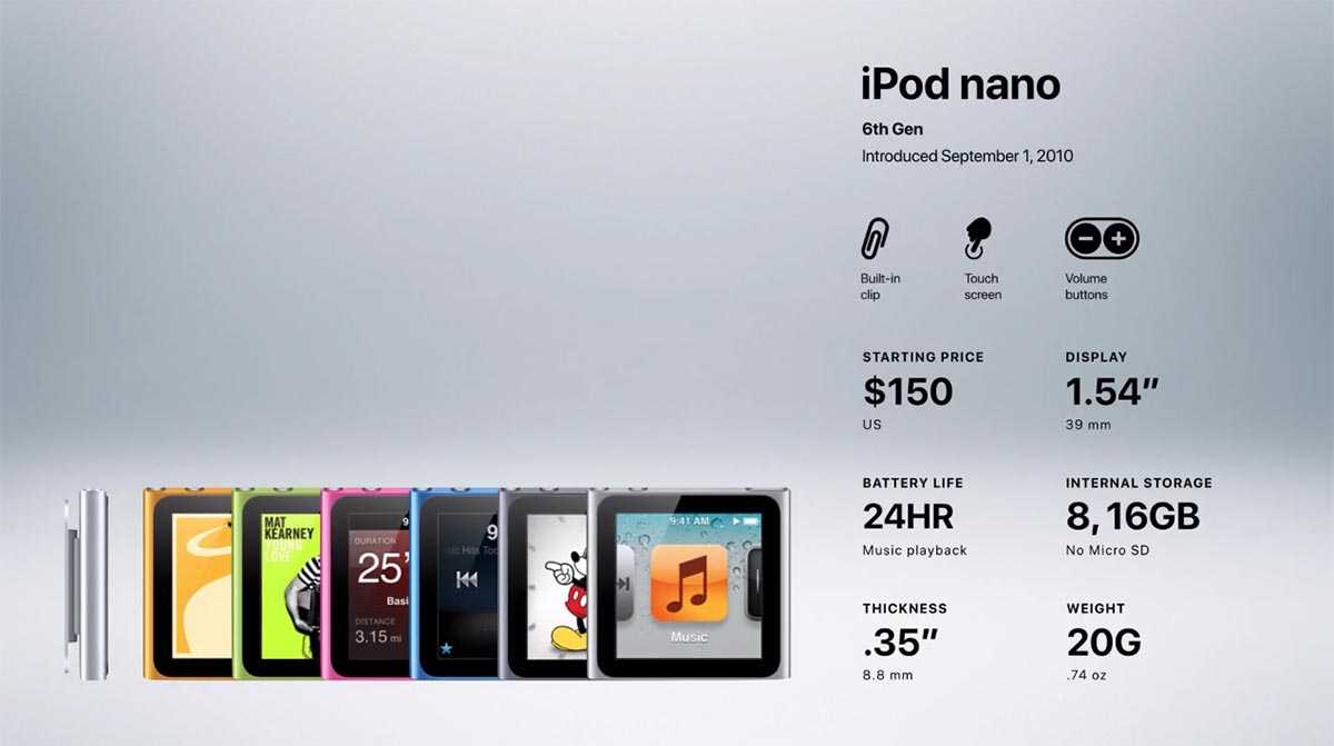 В сентябре 2010 года купертиновцы показали, пожалуй, самый смелый эксперимент во всей линейке iPod. Компактный плеер стал еще меньше и уместился в небольшой стальной брусок.