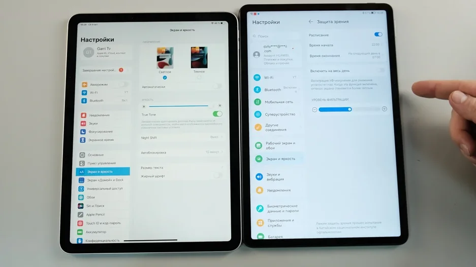 Здесь мы можем включить фильтрацию УФ-излучения для снижения нагрузки на глаза. На iPad такой функции нет.