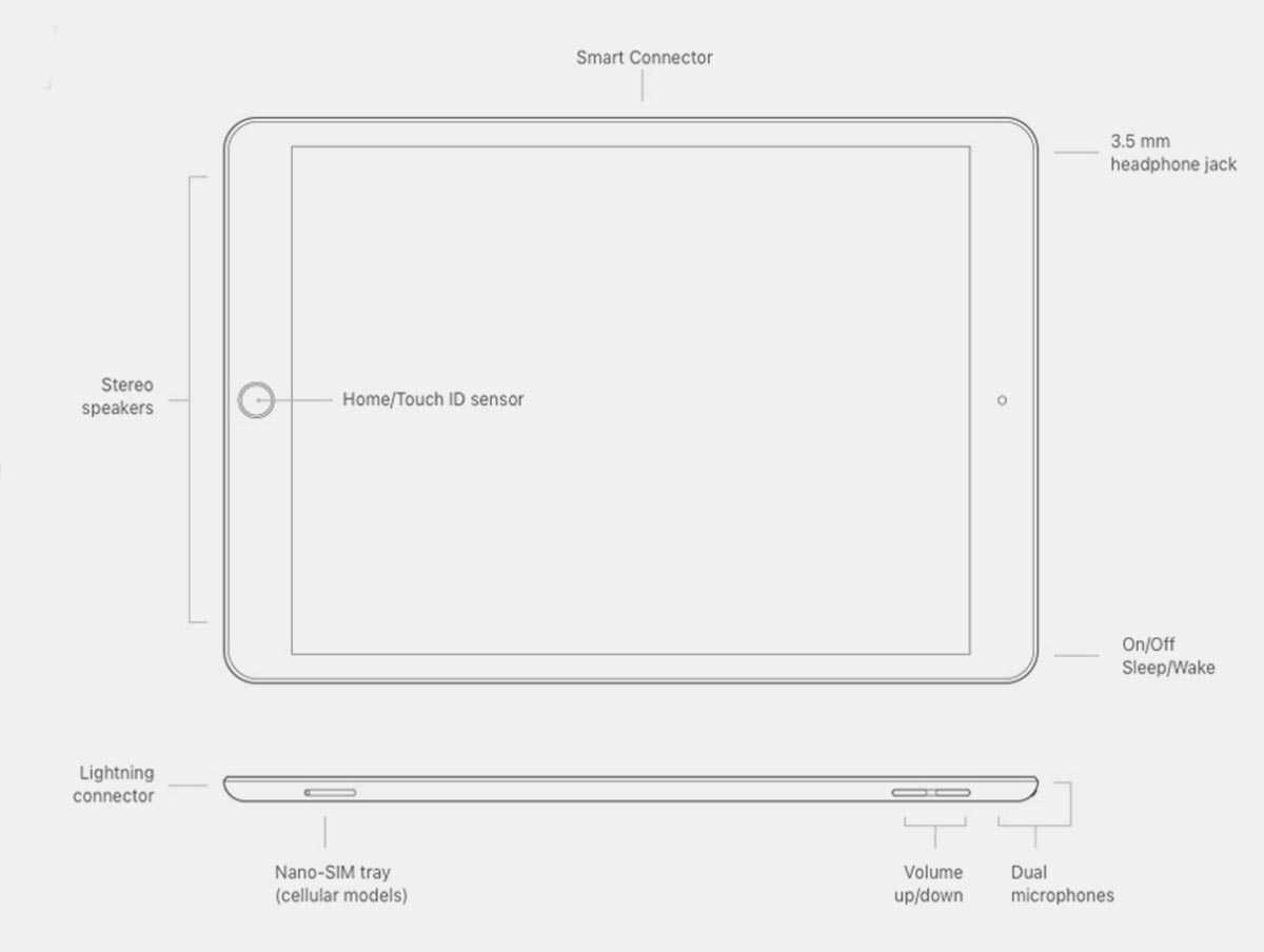 Внешне iPad не отличить от прошлого поколения. Потому что корпус остался абсолютно таким же до последнего миллиметра. На фоне iPad Air и Pro он, конечно, смотрится старовато, но жить можно.