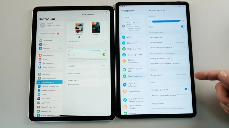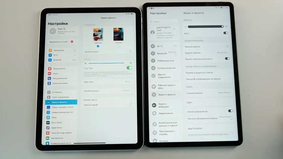 По яркости я не нашел официальных данных, но на глаз у Huawei она выше. Углы обзора также кажутся лучше, так как экран не так сильно тускнеет при просмотре сбоку, как у iPad Air.