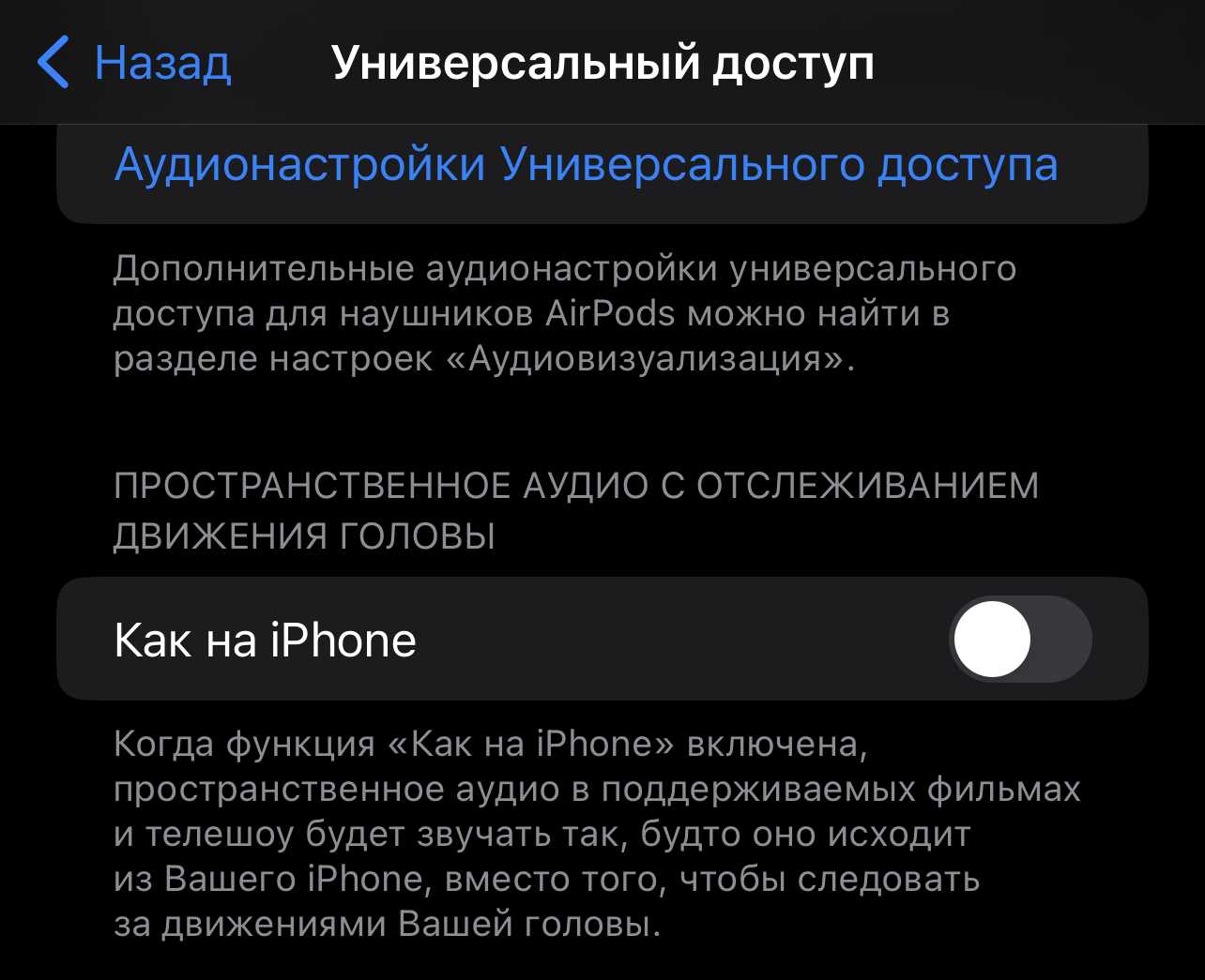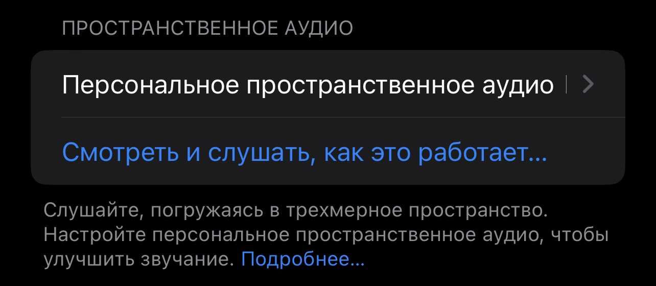 Кстати, если будете пользоваться Пространственным звучанием, обязательно выключите опцию слежения за движениями головы по этой инструкции. Иначе при движении на улице звук постоянно будет «уползать» то в одно, то в другое ухо.