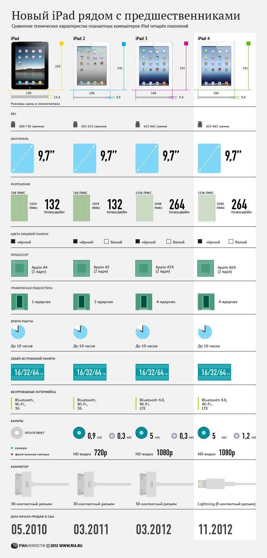 На фото детально представлены сравнительные характеристики трех известных моделей планшетов американского брэнда — в соответствующих графах приведены только те показатели, в которых они различаются.