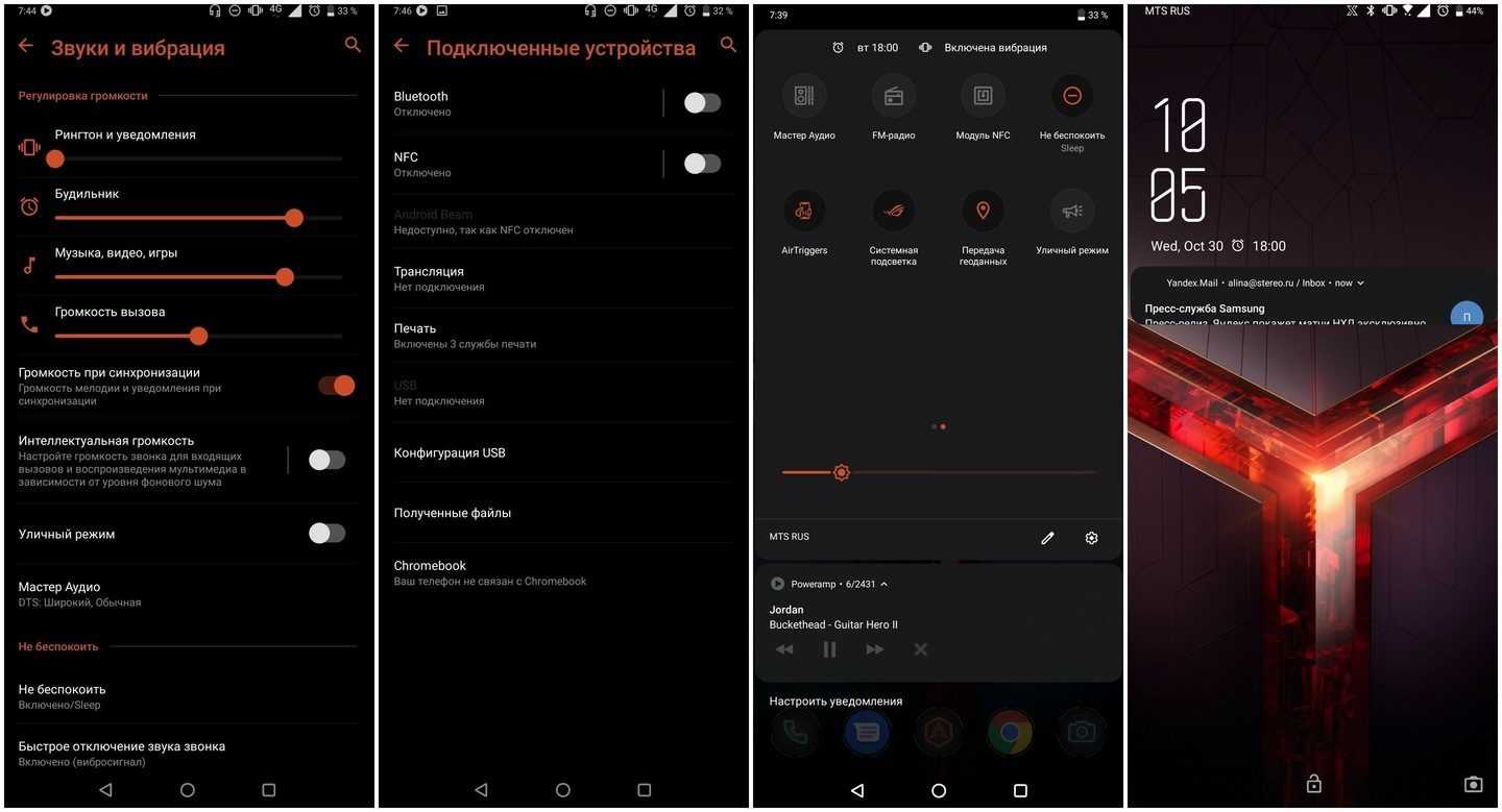 ASUS ROG Phone II получил и все необходимые профили для корректной передачи звука любого качества через Bluetooth (aptX, aptX HD, LDAC), и мини-джек — и впридачу к этому наделен технологией DTS:X Ultra, которая позволяет рассчитывать на виртуальный звук формата 7.1, что полезно во время игры. По качеству звука что с проводами, что без них тоже вопросов нет. Отдельно отмечу работу внешних динамиков — во-первых, их здесь два, во-вторых, оба выведены во фронтальную плоскость, ну а в-третьих, они получили два усилителя NXP TFA9874 и звучат очень хорошо для мобильного устройства. В плане звучания ROG Phone II выдержал высокую планку, заданную предшественником.
