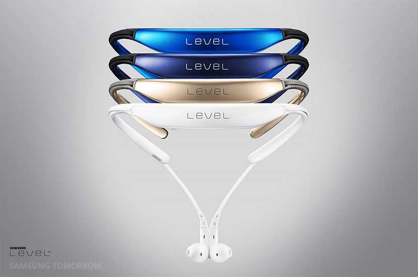 Дизайн наушников Samsung Level смотрится необычно и привлекательно. Большая часть корпуса надеваемого на шею обода выполнены из качественного глянцевого пластика со вставками из мягкой резины. Материалы приятны, кожу не раздражают при ношении. Цветовое решение гаджета Samsung Level предлагается разнообразным: