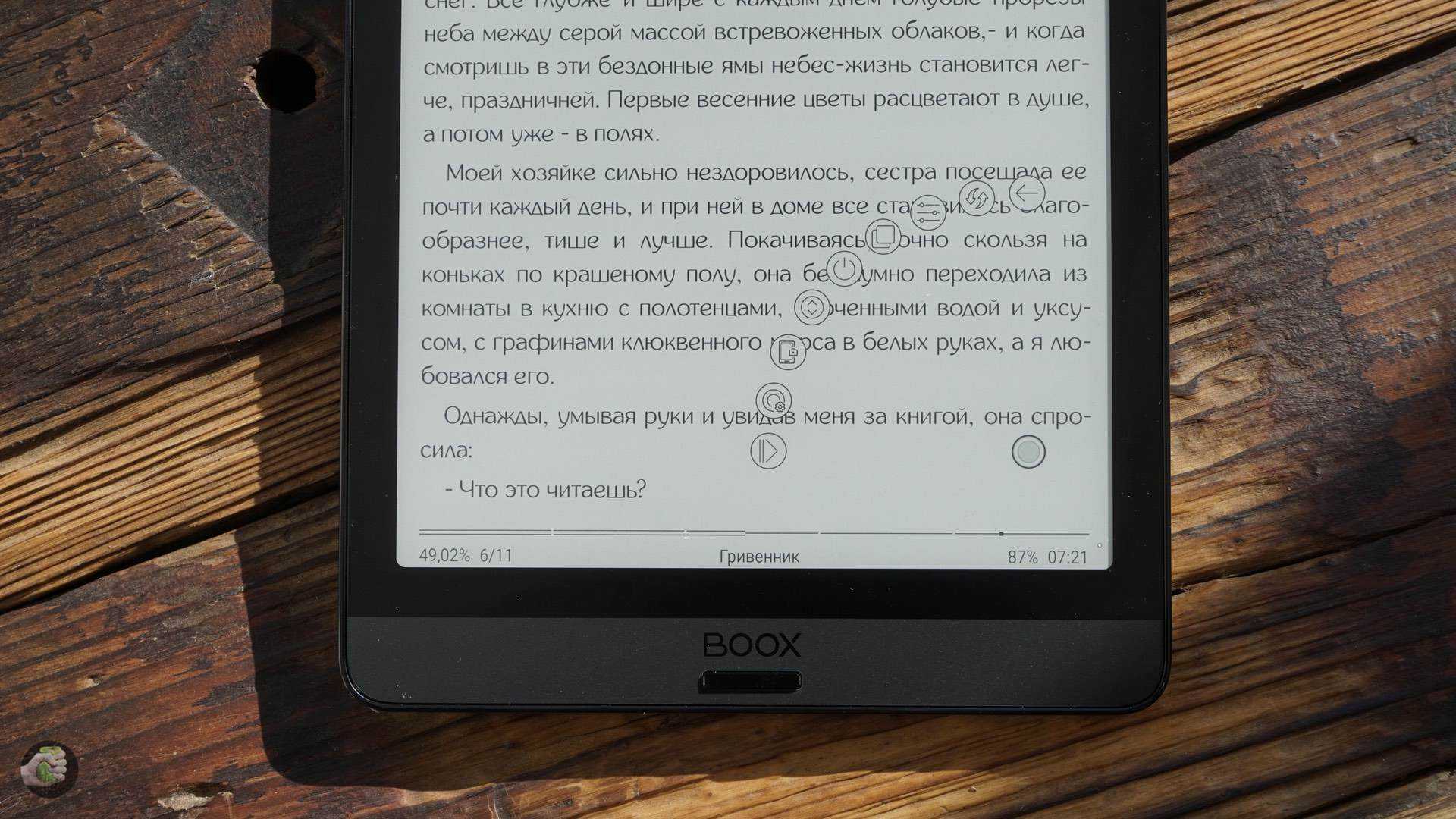 По бокам от экрана находятся сенсорные кнопки для листания («туда» и «сюда» или «сюда» и «туда»?), а надпись BOOX под ним выполняет функцию «Назад» (выход из книг и приложений или отмена текущей операции). Длительное нажатие кнопок штатно выполняет другие функции: «Меню», Back и включение/выключение подсветки. Других функциональных элементов на лицевой стороне нет, от чтения ничего не будет отвлекать.