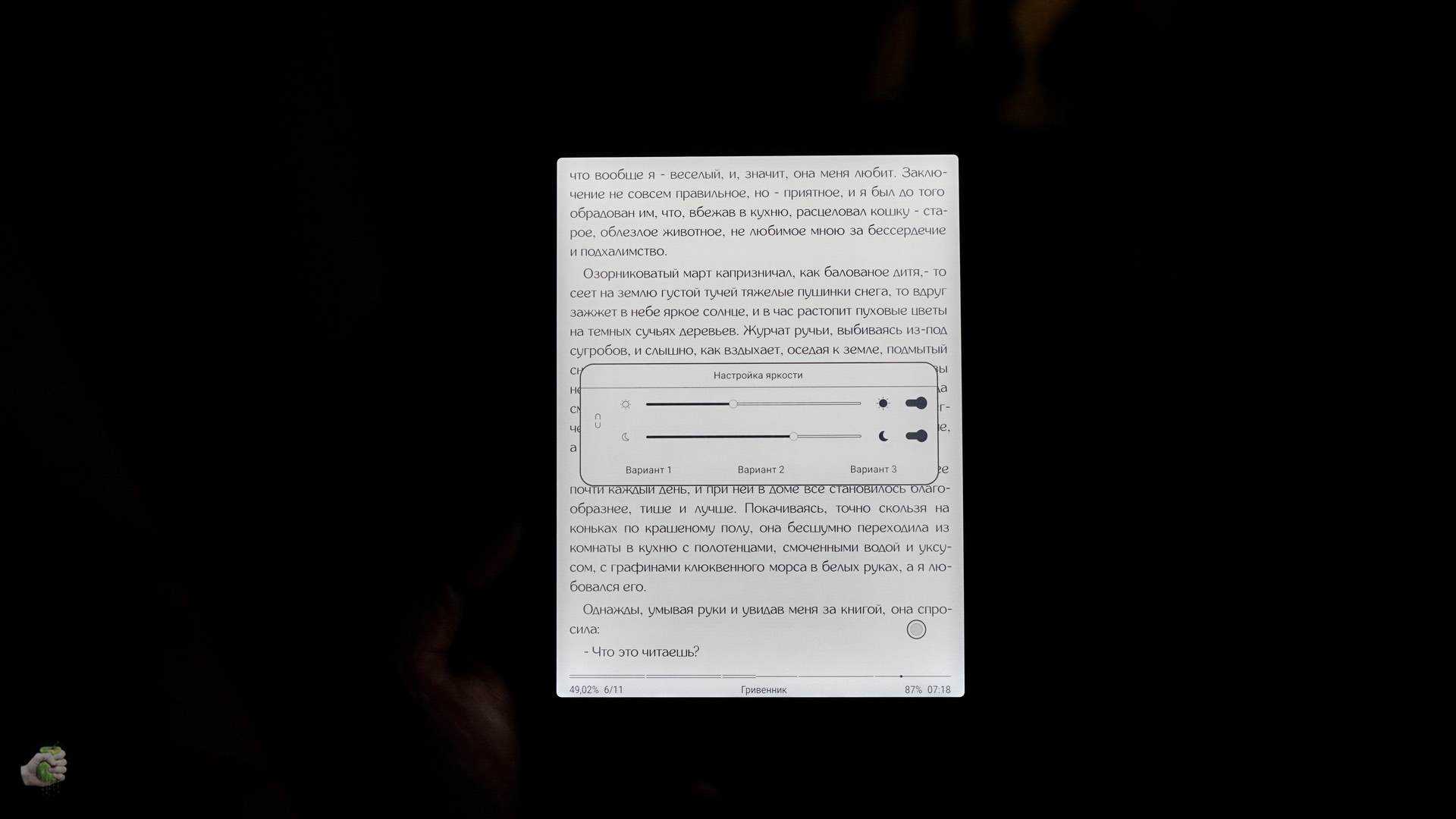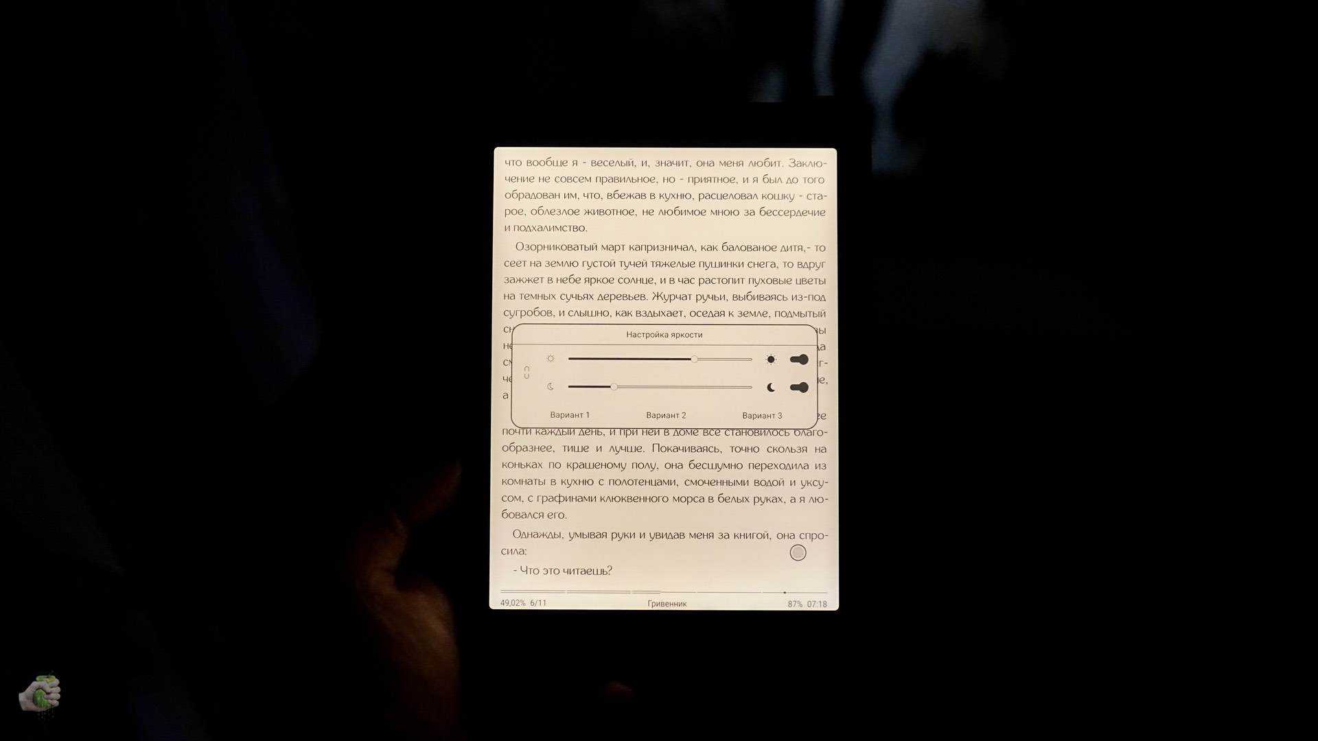 Диагональ экрана шесть дюймов, он прекрасно реагирует на нажатия, не бойтесь использовать знакомые по смартфонам жесты. Установленная здесь читалка позволяет настроить что угодно: шрифт, жирный или нет; хочешь, разверни экран; хочешь, будет курсив. Мои настройки очень просты: яркость всегда включена на минимум (даже днём в помещении читать лучше), шрифт уменьшаю, хочется видеть больше информации на странице, «болд» не использую.