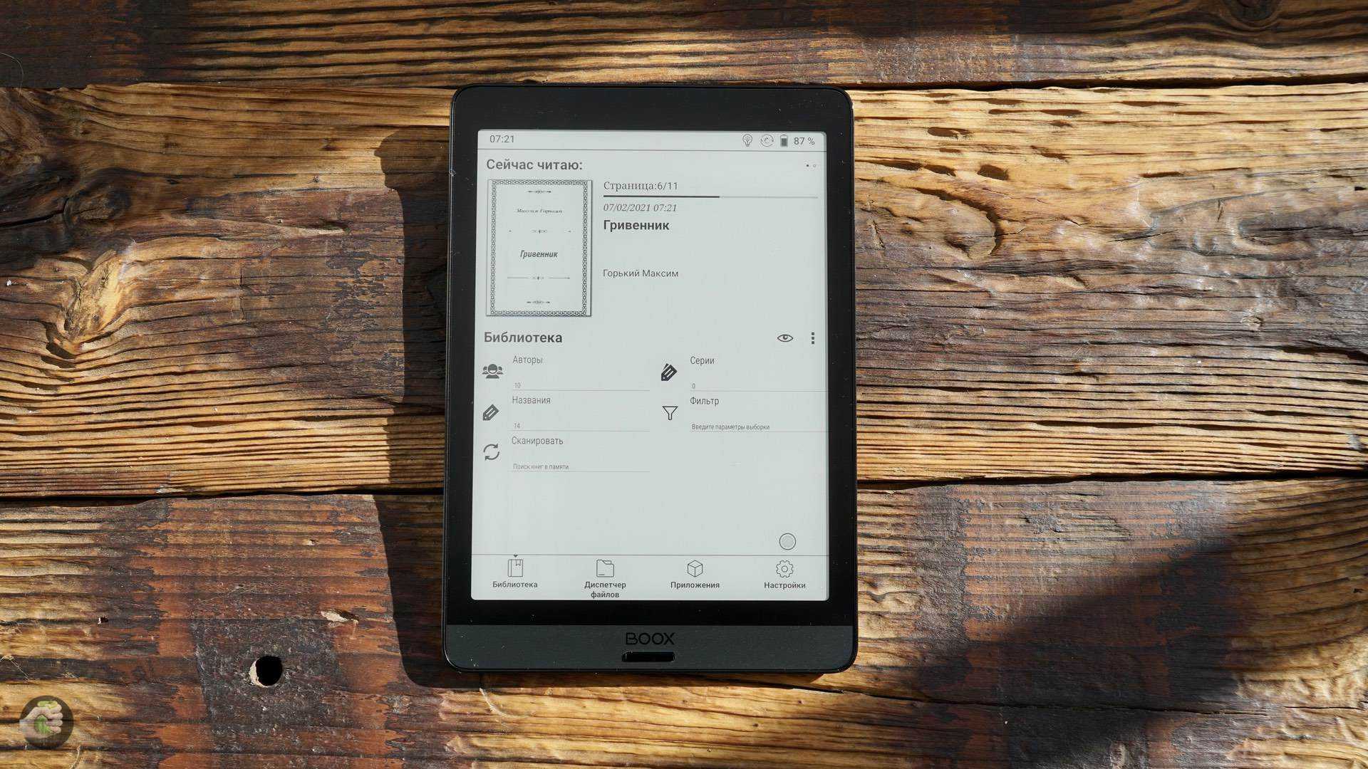 Все топовые технологии в одном месте. Как я и говорил, экран сенсорный, тип — E Ink Carta (это самый топовый экран на данный момент, самая близкая имитация обычной бумаги), функция SNOW Field помогает «чистить» артефакты. Есть и подсветка MOON Light+, спокойно можно читать ночью или в плохих условиях освещения. Помню, мы были в отпуске в Греции и я там постоянно читал с подсветкой на балконе — сигару возьмёшь, вина, хорошо! И не беспокоишь жену светом. Сейчас бы повторить — только без сигары и вина, здоровье не позволяет.