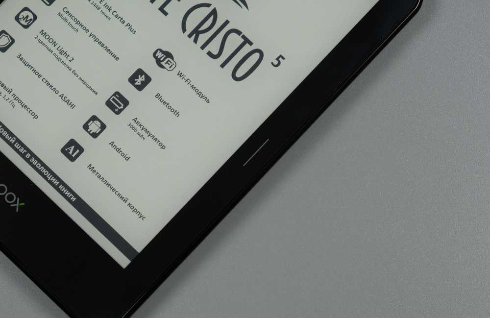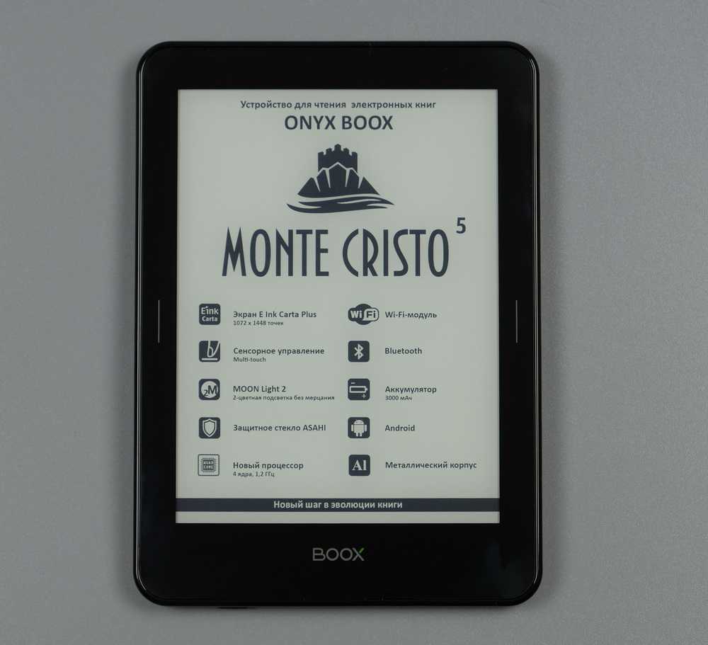 Если мне не изменяет память, то Monte Cristo это первый букридер от ONYX BOOX, корпус которого выполнен из алюминиевого сплава. Нет, память мне все же изменила. Первые модели BOOX 60/ A60/ 601 так же использовали алюминиевый корпус, но букридеров с защитным стеклом, покрывающим всю лицевую сторону устройства, я точно не встречал.