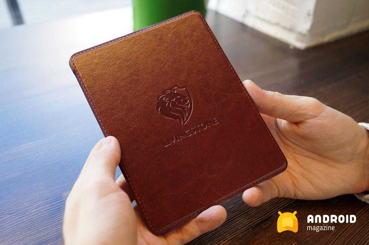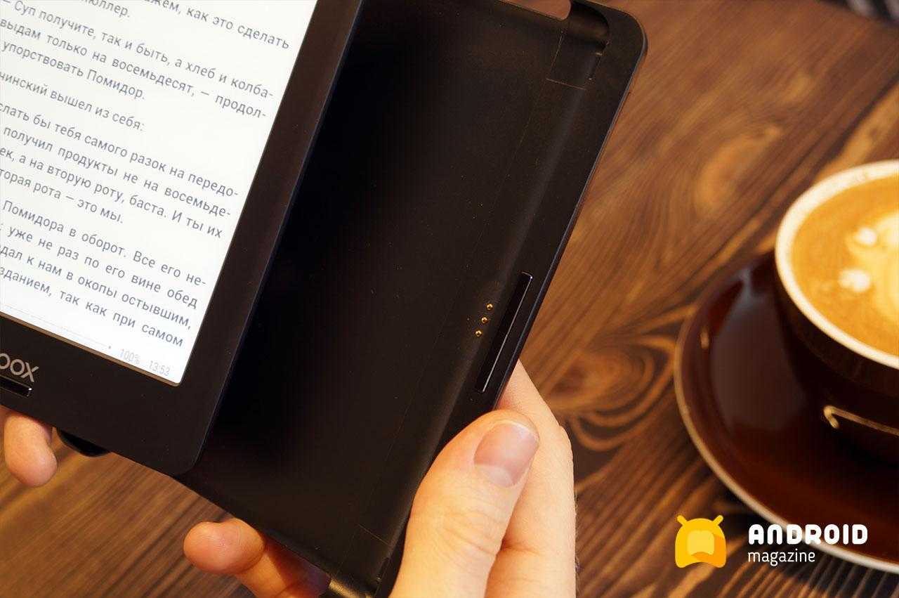 Чехол имитирует грубую кожу с тиснением и имеет жёсткий каркас, а также две магнитные защёлки. Внутри размещён мягкий материал для защиты экрана. Датчик Холла помогает книге автоматически переходить в режим сна, когда обложка закрывается, и просыпаться при её открытии. При чтении она не отвлекает, так как не скрадывает по сантиметру с каждой стороны. Фиксируется надёжно, правда, толщина всей конструкции увеличивается почти вдвое.
