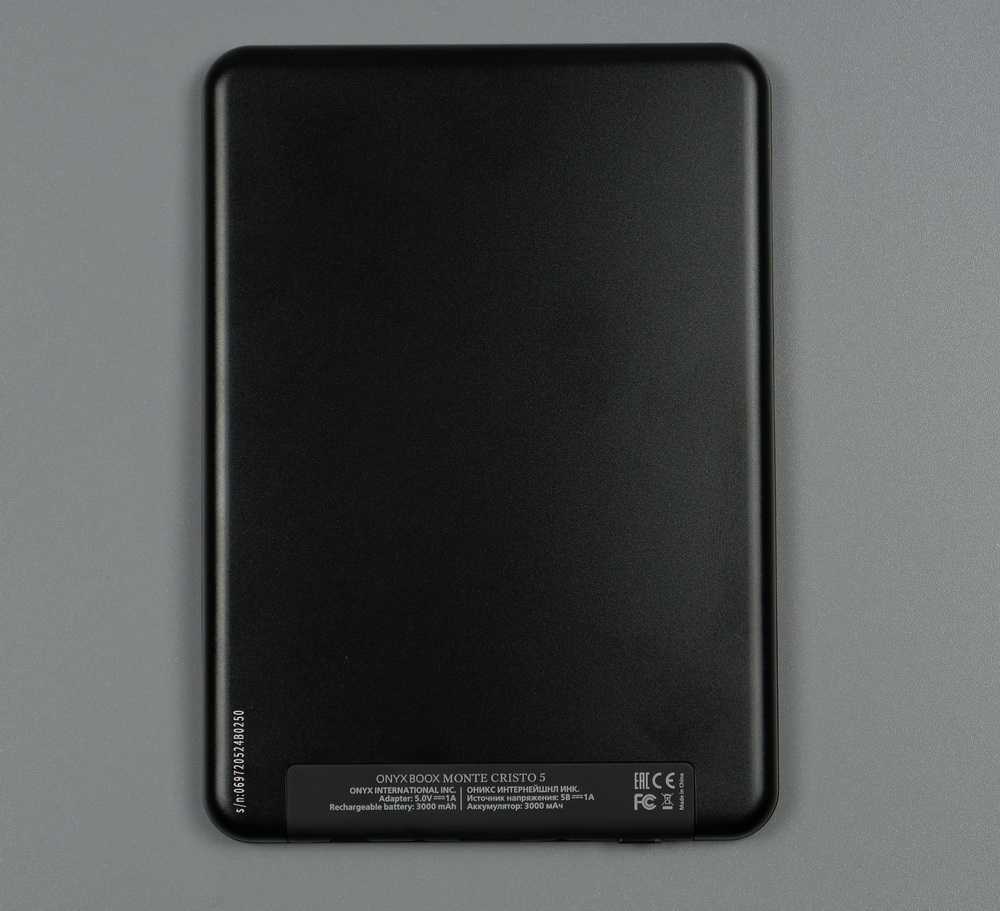 Пятая версия Monte Cristo не получила каких-либо значимых обновлений в плане дизайна. Это тот же строгий и достаточно компактный ридер, выполненный в тёмных цветах. Лицевая часть покрыта стеклом Asahi — не менее эффективным японским аналогом знаменитого Gorilla Glass. Остальная часть корпуса закрыта пластиной из алюминиево-магниевого сплава. Конечно, металл не сделал электронную книгу ударопрочной, но значительно снизил шанс повредить устройство при падении. Такая конструкция значительно надёжнее простых пластиковых корпусов.
