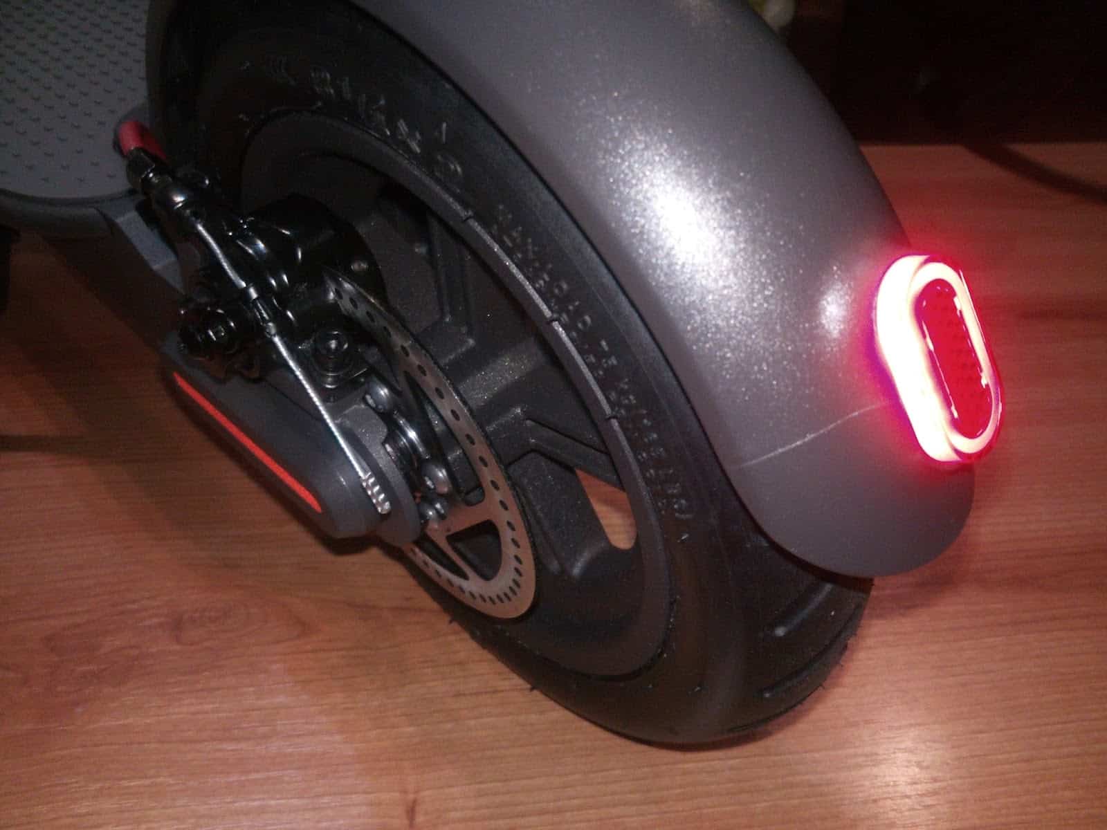 На пластиковом щитке заднего колеса расположена красная задняя фара – стоп-сигнал. Она непрерывно горит после включения самоката и начинает мигать при использовании тормоза.
