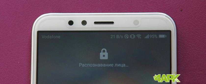 Рамки по краям экрана достаточно тонкие. В верхней части лицевой панели светодиодный индикатор, датчик света (который притворяется второй фронтальной камерой), сама фронтальная камера, разговорный динамик и незаметная селфи-вспышка. Фронтальная камера нужна и для разблокировки гаджета при распознавании лица. После нажатия кнопки включения и до того, как лицо будет распознано, на экране можно увидеть соответствующую надпись.