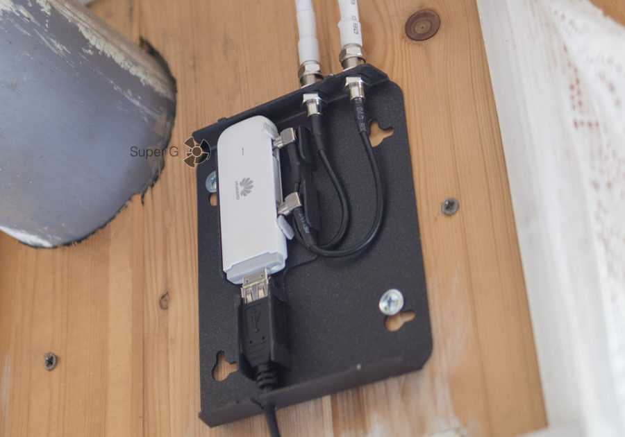 Свисток уже закреплён в специальном держателе. С одной стороны к нему подходят два коаксиальных кабеля, соответственно, держатель должен находиться более менее близко ко входу коаксов в помещение. С другой стороны, USB-кабель для соединения самого свистка и роутера достаточно длинный. Это даёт свободу разместить держатель в более удобном для себе месте.