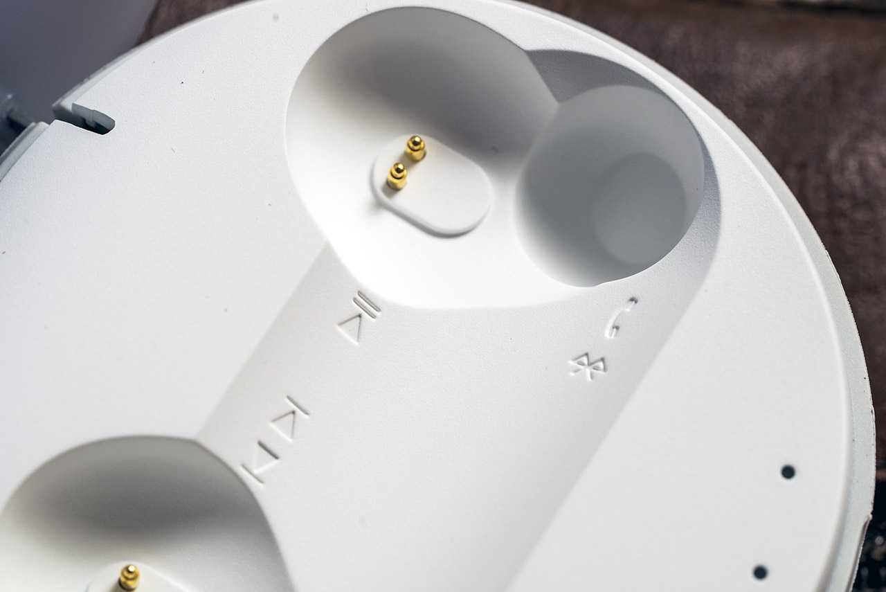 Пластик толстый и не хрустит, как тонкая пластмасса дешевых китайских наушников. Кнопок на кейсе никаких нет, под крышкой размещен индикатор заряда из трех диодов. Это удобно: наглядно видно степень и статус зарядки.