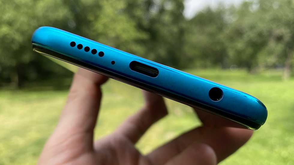 На нижнем торце — 3,5-миллиметровый аудиовыход, решетка динамика, отверстие микрофона и разъем USB-C.